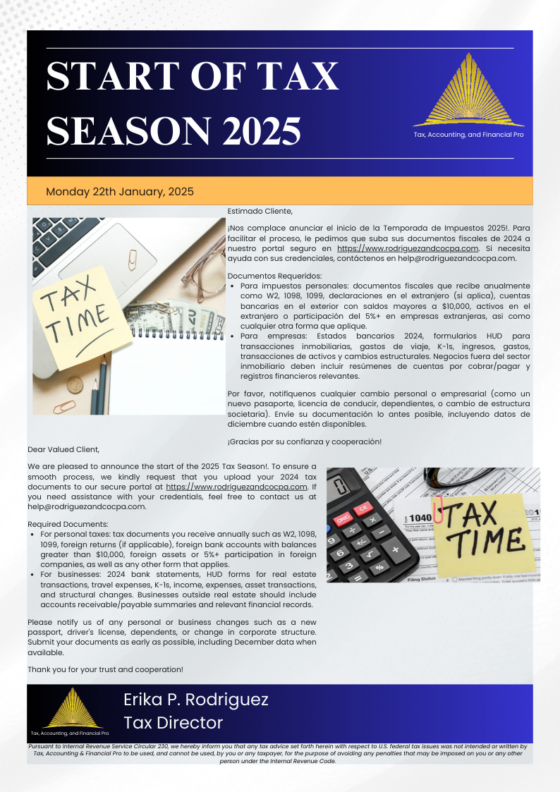 "En Tax, Accounting and Financial Pro., nuestra misión es proporcionar servicios contables de alta calidad y soluciones financieras confiables para usted y sus compañias. Nos comprometemos a ayudar a ustedes y sus compañias a mantener una gestión financiera precisa y eficiente, permitiéndoles tomar decisiones informadas que los ayuden a alcanzar sus objetivos comerciales eficientemente".